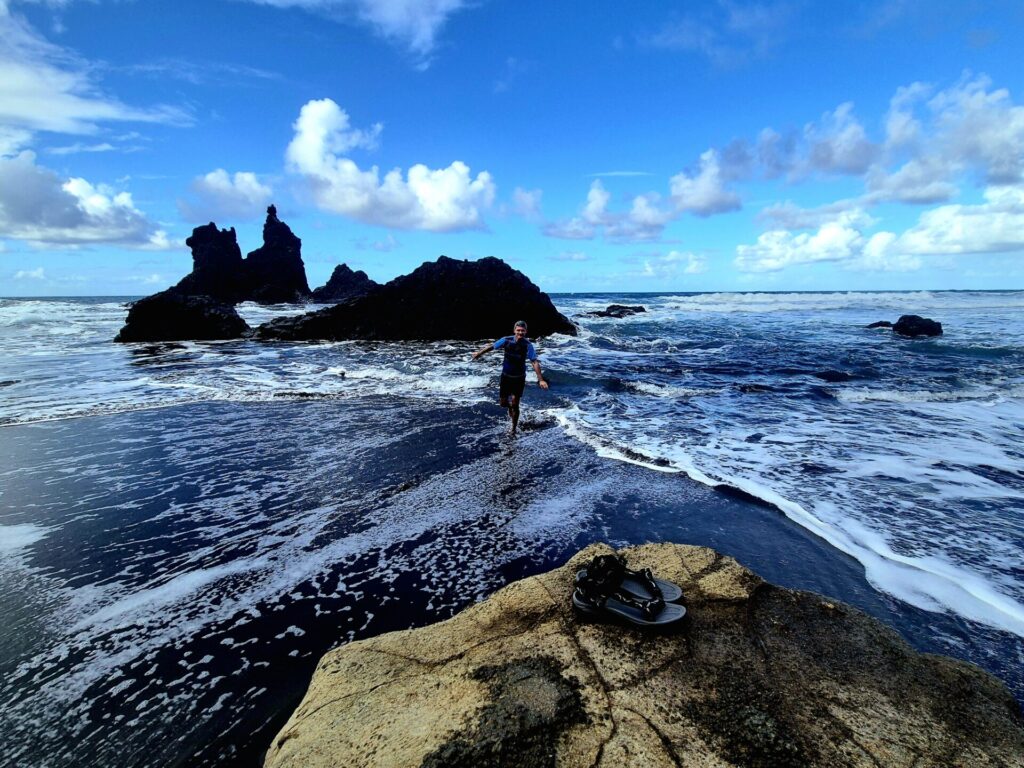 Am găsit o plajă pustie, cu un nisip negru și fin ca asfaltul, dar moale ca zăpada. Stâncile din zare spărgeau cu zgomot valurile oceanului, încă puțin supărat după ce a trecu Claudia pe aici. Claudia este numele dat furtunii ce a măturat țărmurile cu o săptămână înainte.